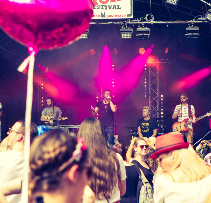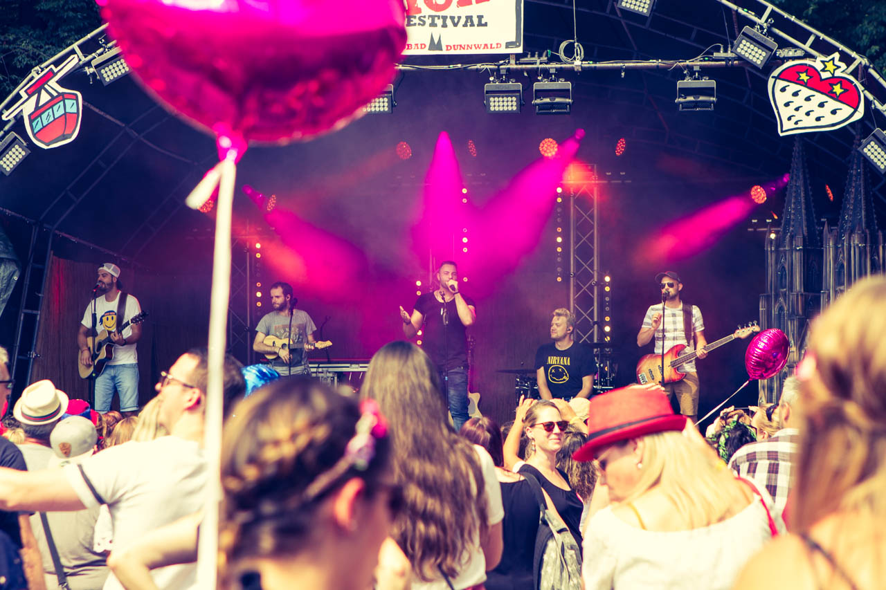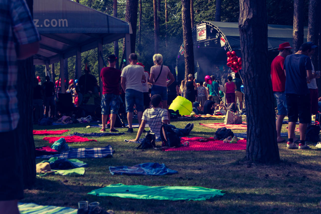 Als wir, etwas verspätet, ankommen, steht bereits die erste Band auf der Bühne. Die vier Jungs von Planschemalöör sind der perfekte Einstieg, um mit ihrem „Surfpop op kölsch“ in Festivalstimmung zu kommen. Trotzdem führt der erste Weg zum Kassenzelt um Bons zu kaufen. Die Preise sind ok, das Kölsch kostet 3€. Gegen den Protest eines Teils unserer Gruppe fangen wir bei 28°C dann doch lieber mit Radler an. Ein wenig unglücklich sind wir über die Einwegbecher. Es gibt zwar ein Pfandsystem, damit diese nicht einfach im Wald landen, doch das haben viele Festivalbesucher offensichtlich nicht verstanden. Trotzdem würde uns eine Lösung ohne so viel Plastikmüll natürlich besser gefallen. Der Veranstalter hat aber schon angekündigt, dass man sich mit dem Problem für nächstes Jahr beschäftigen wird.