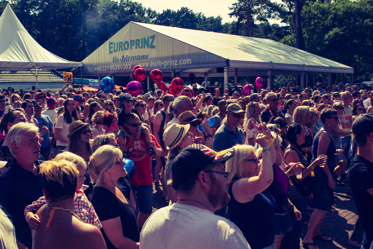 Dass die drei Bands des heutigen Mittelblocks allerdings kaum vom Karneval zu trennen sind, würde wohl niemand bestreiten. Bei der „Loss mer singe“ Tour landeten Lupo mit ihrem Hit „Für die Liebe nit“ noch knapp hinter Miljö auf Platz zwei. Heute sind sie die ersten, die einen von drei „Loss mer singe“ TOP10 Siegertiteln präsentieren und die Menschen von den Liegewiesen vor die Bühne locken. Dicht gefolgt von Miljö, für die der Auftritt hier natürlich ein absolutes Heimspiel ist. So wie viele der Besucher waren auch sie zu Schulzeiten praktisch Dauergäste im Waldbad, erzählt Mike, bevor die Band es bei „Kölsch statt Käsch“ Scheine aus der Konfettikanone ins Publikum regnen lässt.