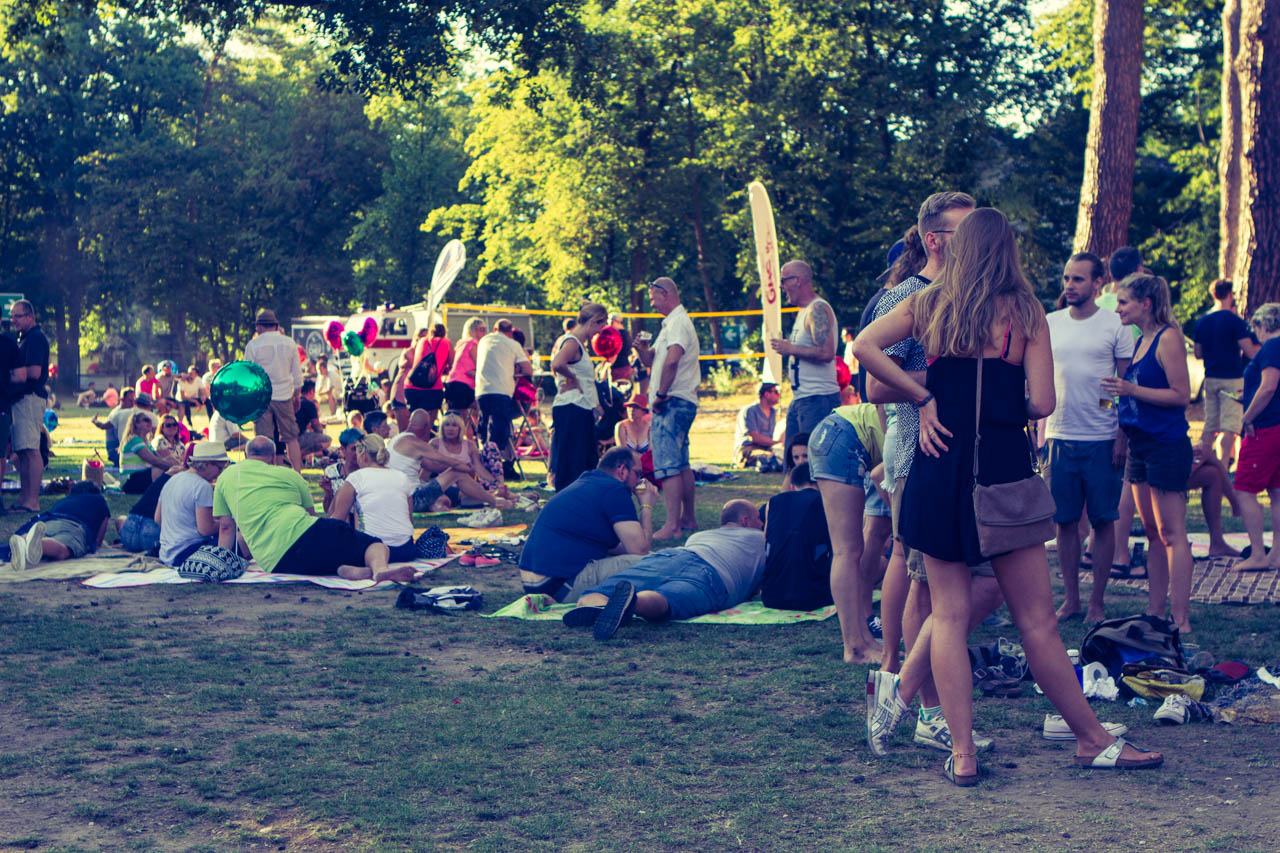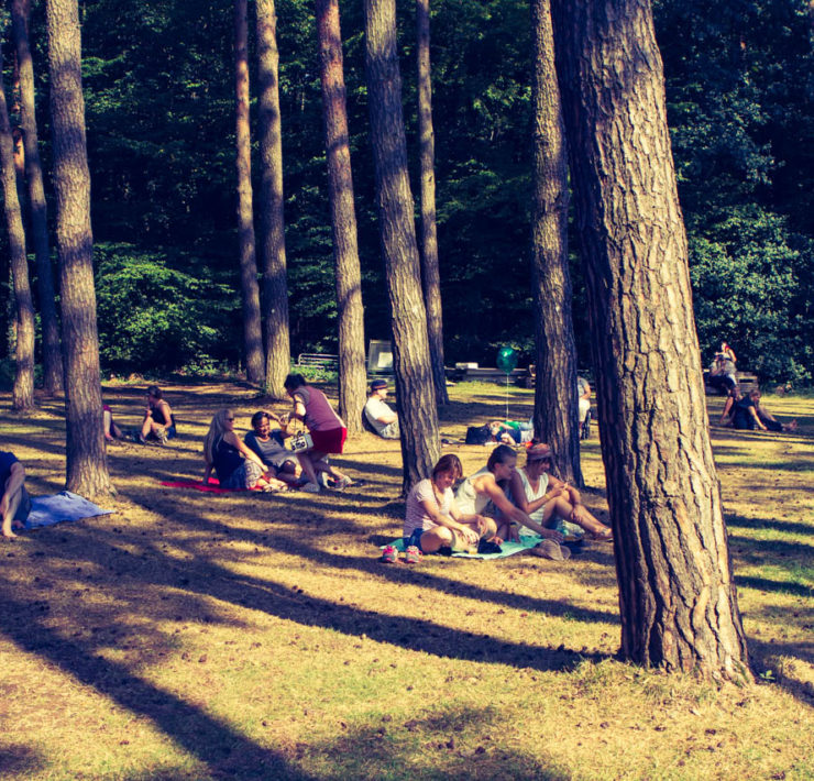 Auch wenn wir als Dellbrücker den Weg durch die Botanik zum wunderbaren Waldbad Dünnwald natürlich im Schlaf finden würden, die Musik, die durch die Bäume schallt, lässt eigentlich keine Zweifel daran, wo es langgeht. Am Wildgehege noch einmal rechts, die kleine Brücke über den Mutzbach queren und da ist es. Die unzähligen Fahrräder lassen ahnen, dass viele Dünnwälder und Dellbrücker hier sind. Mit dieser Vermutung liegen wir allerdings, wie sich zeigen wird, nicht ganz richtig. Als Mike von Miljö nämlich später um Handzeichen bittet, wer es denn von der linken Rheinseite herüber geschafft hat, stellt sich heraus: erstaunlich viele. Aber so weit sind wir noch nicht.